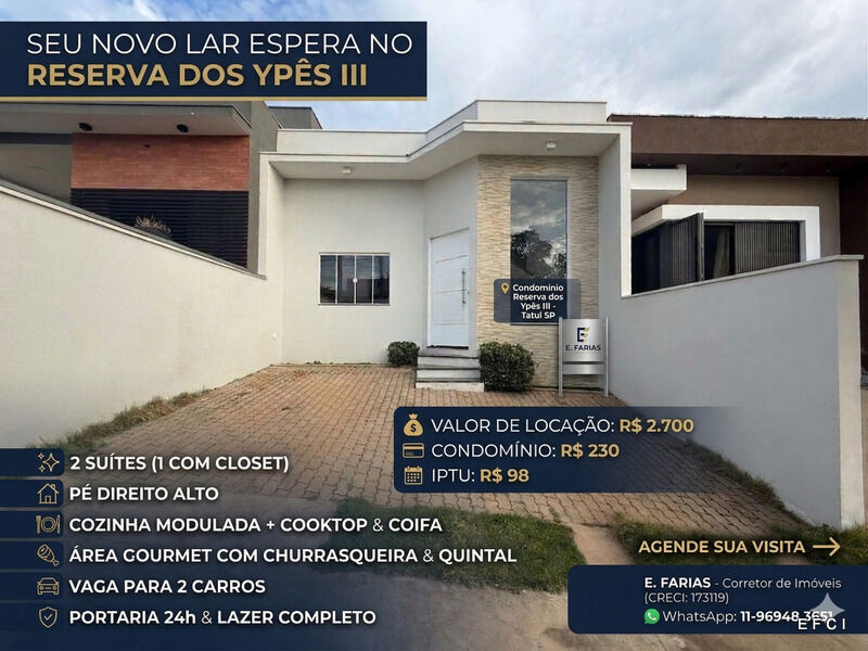 Se você está procurando uma casa em condomínio em Tatuí, com 2 suítes, esta é uma excelente oportunidade para morar com conforto e segurança, em um dos projetos mais modernos da cidade.